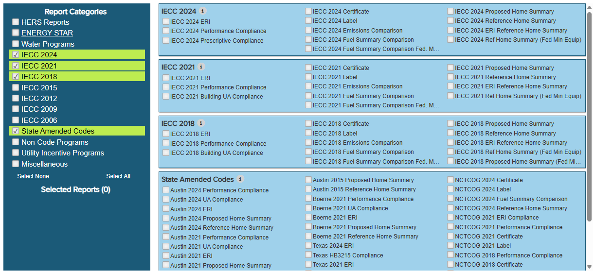 Viewing any of these reports in Ekotrope RATER will not incur that fee. Energy code reports will only incur this fee when they are downloaded or emailed. Qualifying reports for this energy code report fee are all State and Local Amended code reports, IECC 2024, IECC 2021, and IECC 2018 reports. These reports are all located in their respective categories in our report generation menu (see image below). This will be applied to projected and confirmed reports.