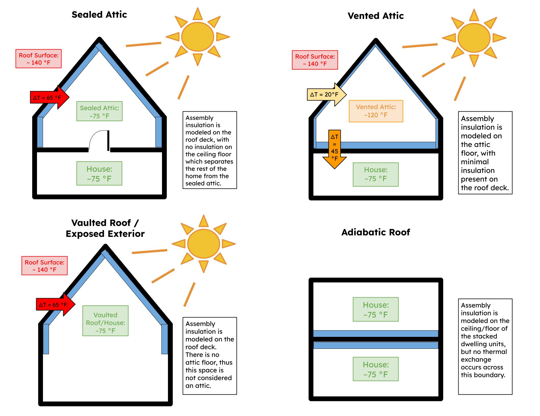 Diagrams of each roof type. The temperatures shown are representative of temperatures seen during the summer in warm climate zones.