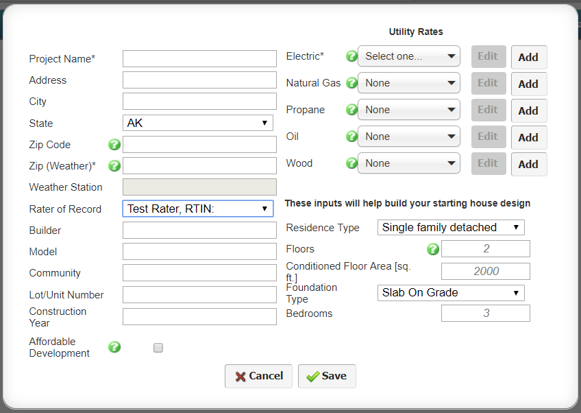 4. Input Basic Project Information: The dialogue that pops up contains fields for entering high-level information about the home. The fields that need data in order to create a project are the Project Name, Zip (Weather), and an Electricity Rate*. Changes to these values after the fact can be made in the next step of the tutorial.