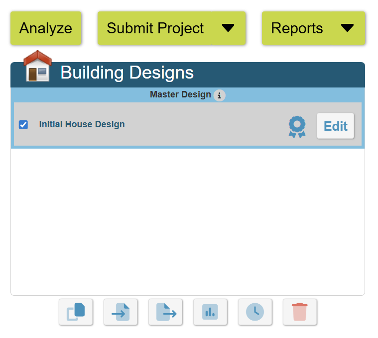 6. Open the Building Design: Ekotrope allows users to create multiple building designs to model different scenarios. Since only one design will be built, Ekotrope requires that one design be marked as the Master Design, which will be at the top and designated with a blue ribbon. The Master Design must be used for Confirmed Reports and will be used for batch functions in Ekotrope. For more information on building designs, see this help article. Open the Edit Design page by clicking the "Edit" button to the right of the Design name. The Edit Design page is where all of the information about a home design is entered. Each tab represents a different category of inputs. Take a moment to allow the “Quick Results” on the far right to load. Note the HERS score and Annual Energy Bill are shown for convenience. For more information regarding the various features of the Quick Results tab, see this help article.