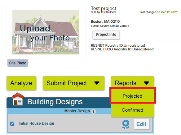 11. Print Reports: Click “Save and Close” at the bottom of the editing interface. Hover over the large yellow “Reports” button; click “Projected.” Check all relevant reports. Click “Ok.” You can digitally sign all reports by clicking “Sign All Reports”. If you would like to add your signature to Ekotrope, fill out the PDF in this help article and send it to support@ekotrope.com. Reports can be downloaded as PDFs by clicking the “Download Reports” button.