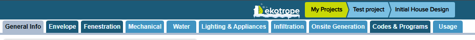 7. Modifying Building Design: Once you click the "Edit" button next to a Building Design name, you'll see a screen with a bunch of tabs at the top as shown below. Each tab represents different component or section of the building design and has inputs to model the house. All the tabs that are highlighted in a light-blue background are not mandatory* for the Total UA analysis and can be left as they are.