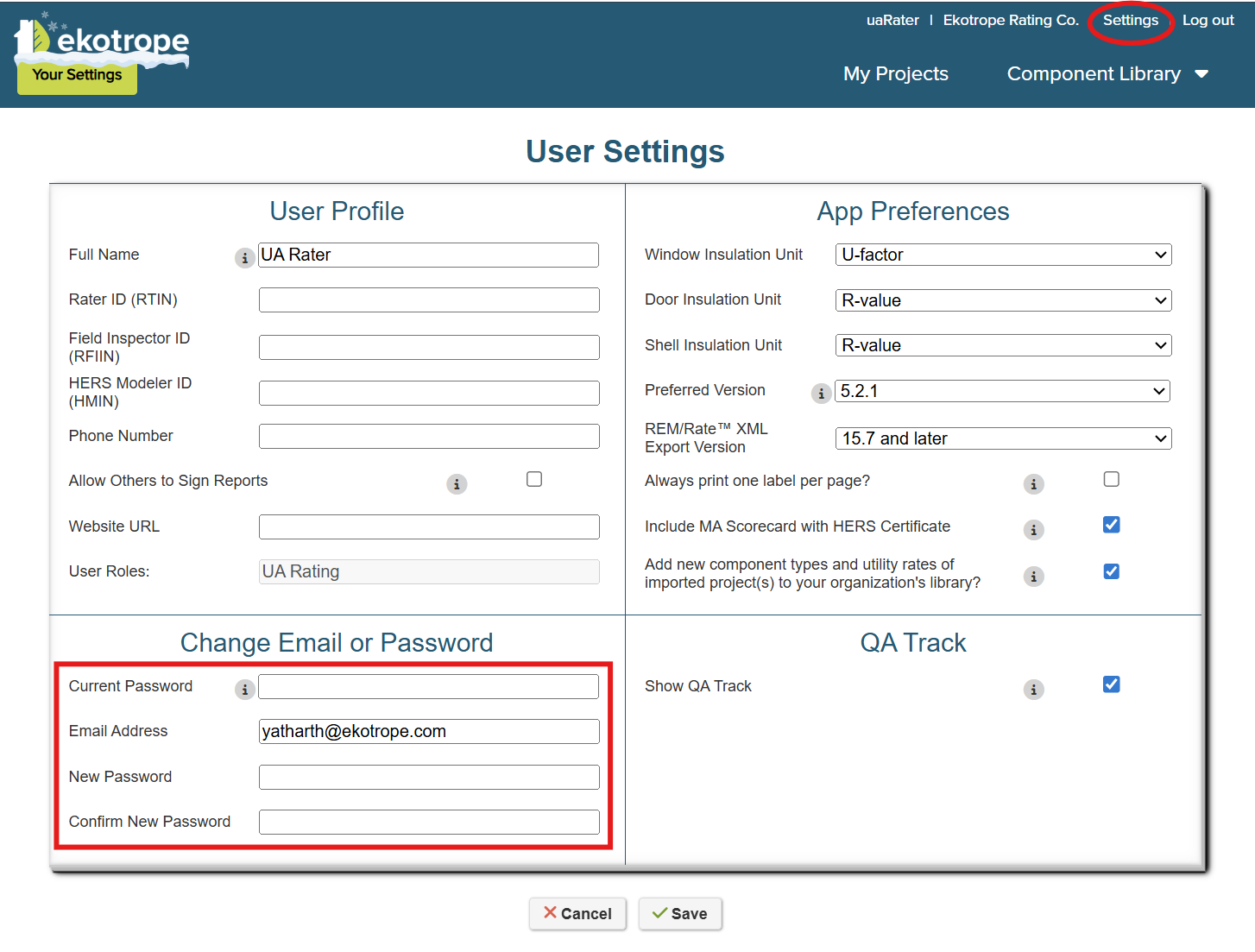 2. Set User Settings and Change Password: Choose the “Settings” option found at the top of the page. This page can be used to update settings such as your preferred display units, email address, and Rater or Field Inspector ID. Navigate to the bottom of the page to update your temporary password to one you will remember. Be sure to click “Save” to apply the changes.
